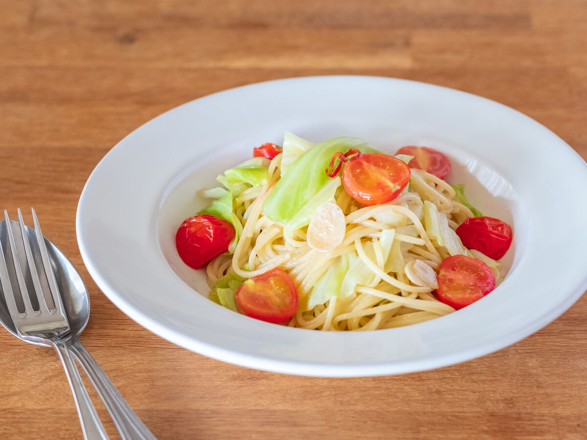 今回はニンニクと鷹の爪、キャベツとプチトマトを合わせて、アンチョビの風味が効いた野菜たっぷりのおいしいパスタに。