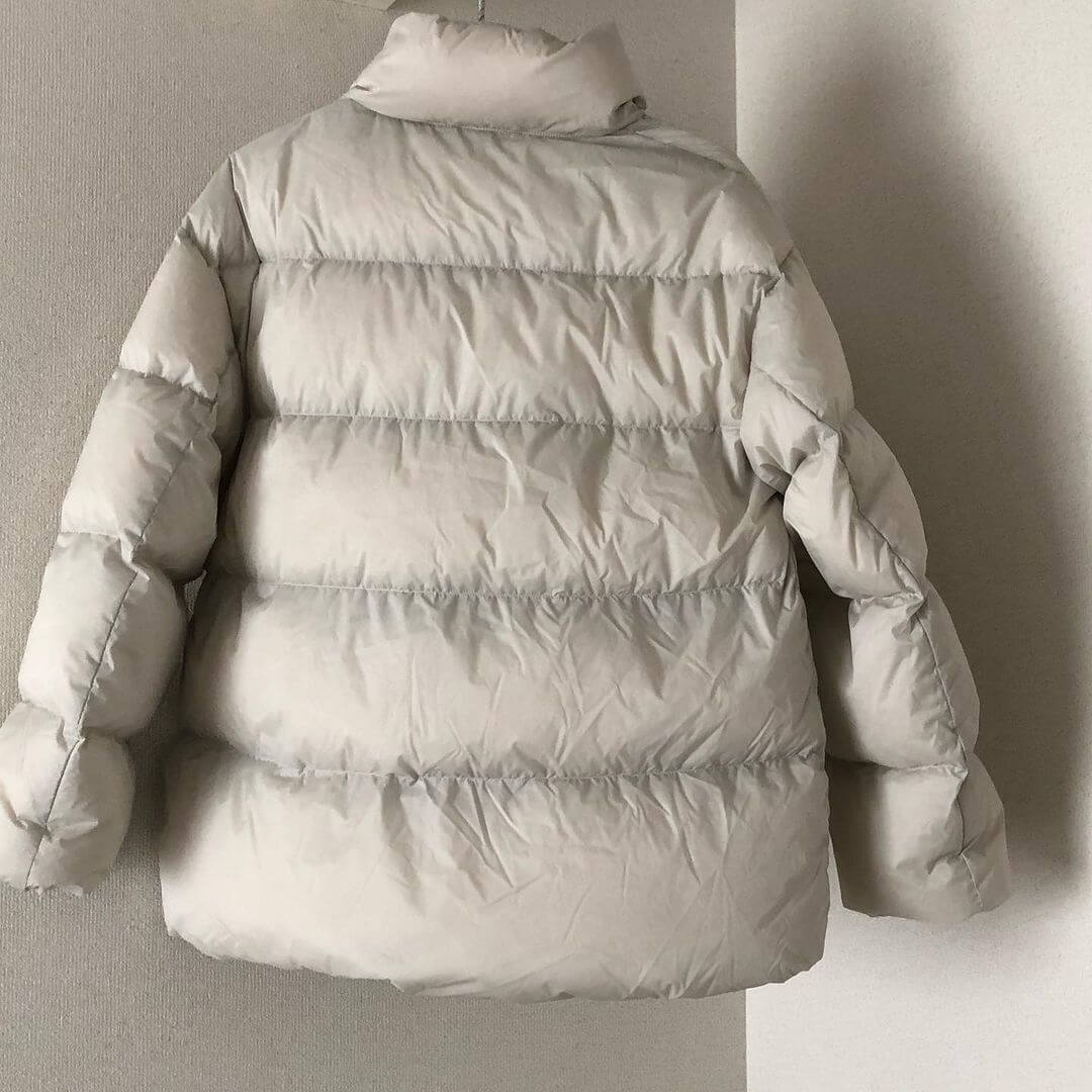 ステッチ幅が細すぎず太すぎず、高見えするショート丈のコクーンダウンジャケット。