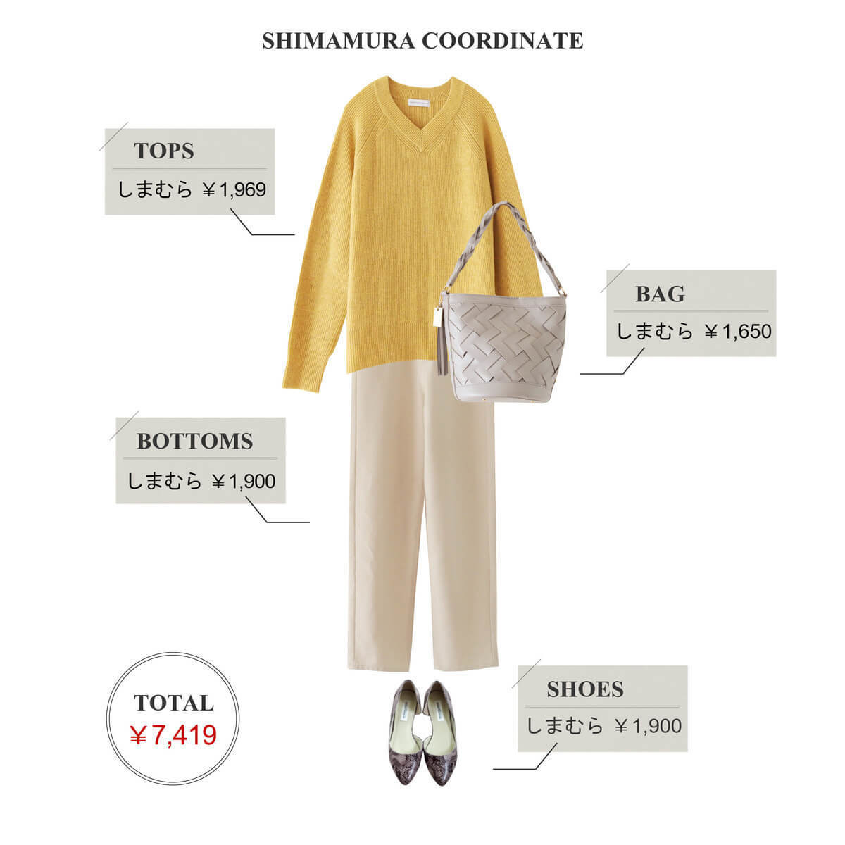 バッグはグレーとベージュの中間色のグレージュで、イエローとも好相性。