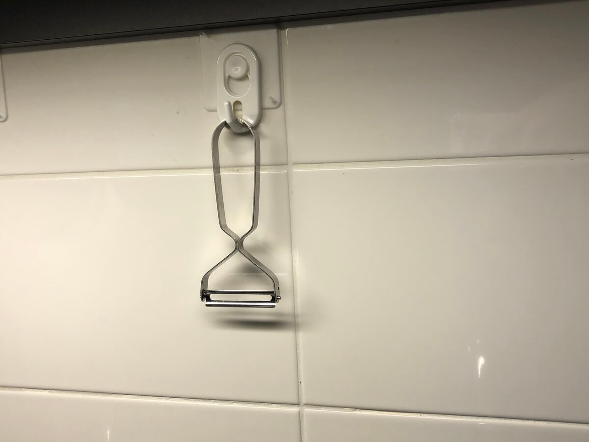 セリアの「ステンレスシンプルピーラー」は取っ手部分がプラスチックでカバーされていないので、洗った後フックにかけられるようになっています。