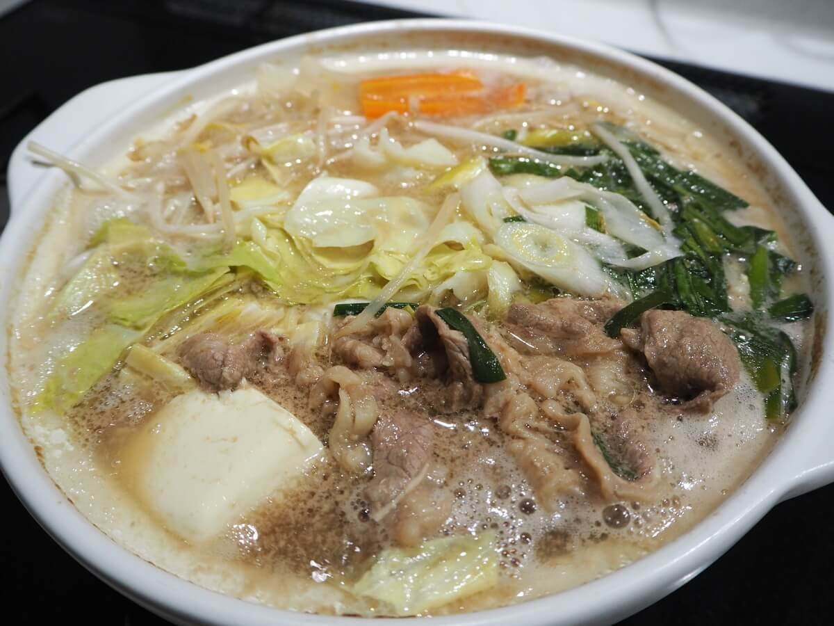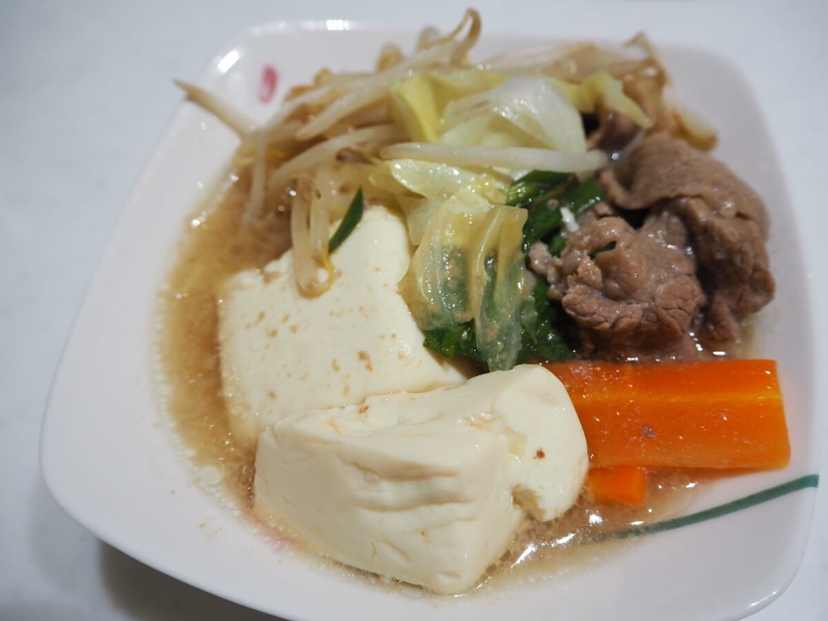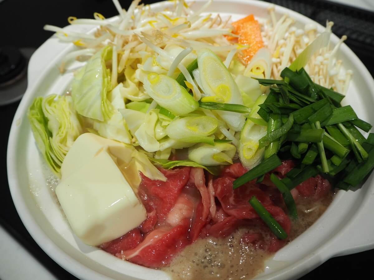 牛肉、キャベツ、もやし、ねぎ、にら、大根、人参、えのき、豆腐です。火の通りにくい具材から順番に入れて煮込んでいきます。
