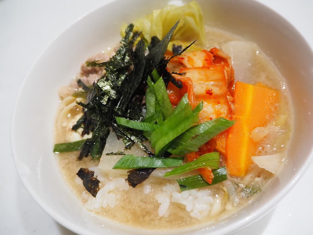 これだけでもいいのですが、トッピングにキムチと刻み海苔、刻みネギを添えてみました。