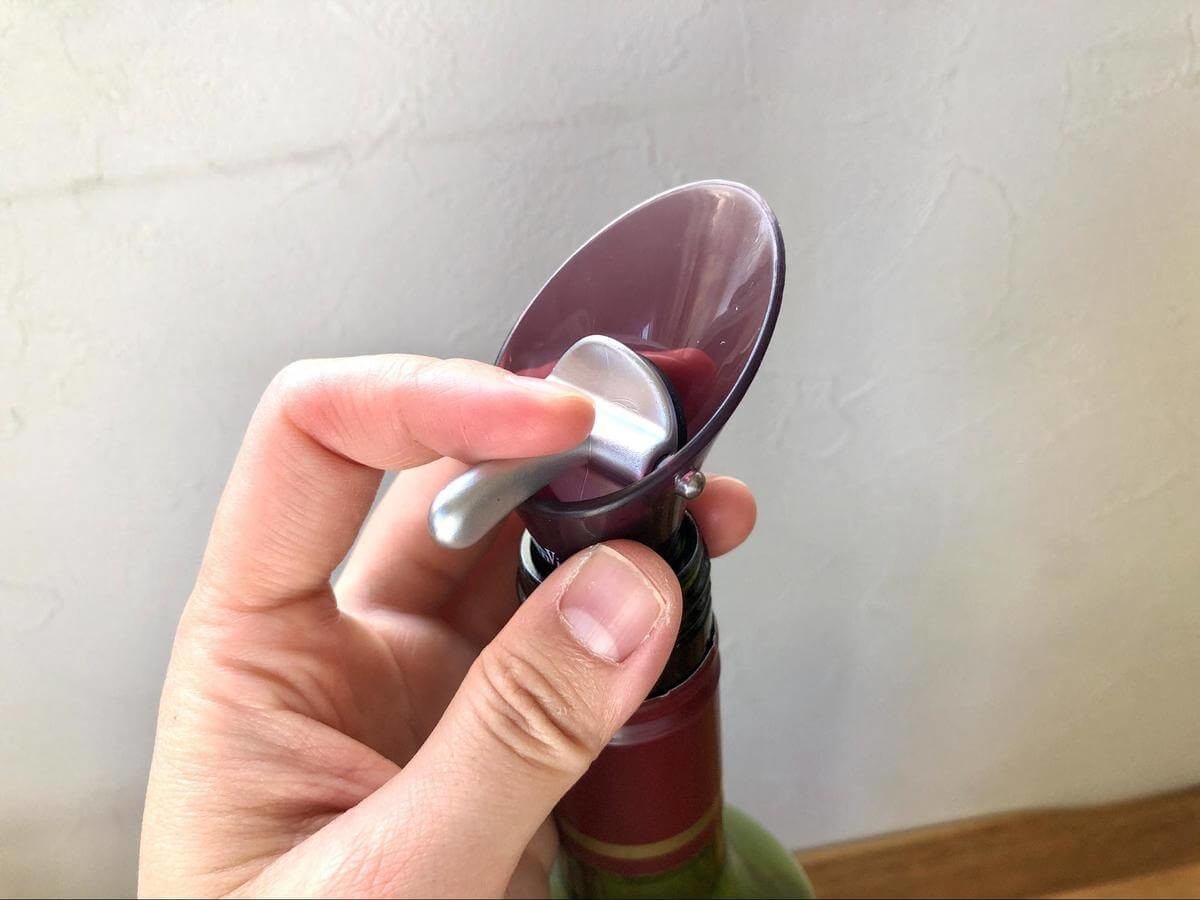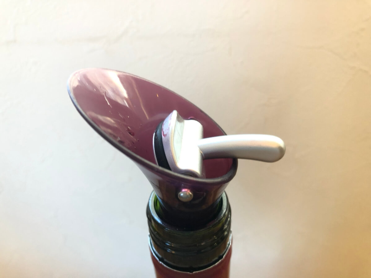 こちらの製品の良いところは、これをつけたまま保管も注ぎもできるという点です。 ストッパーのシルバーの取っ手を下げれば、ワインが注げます。