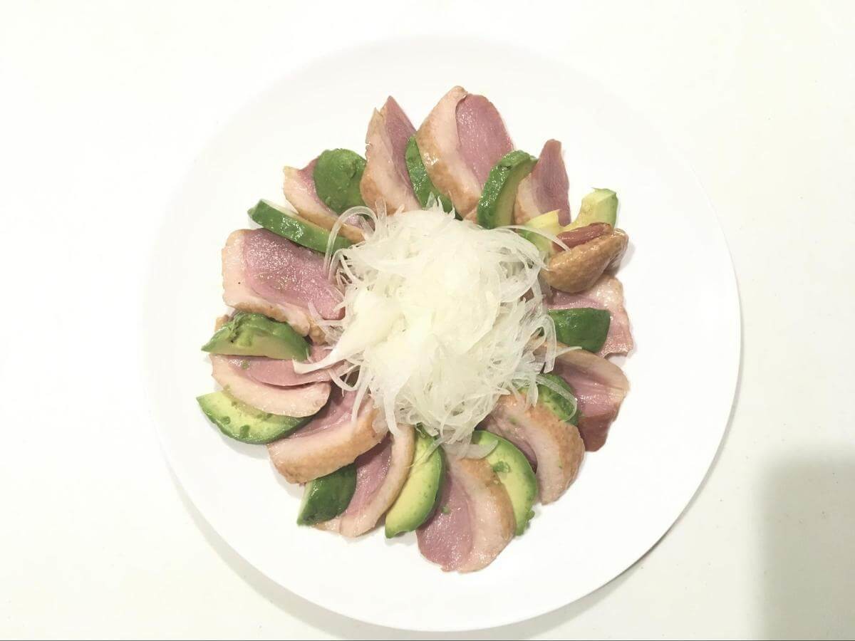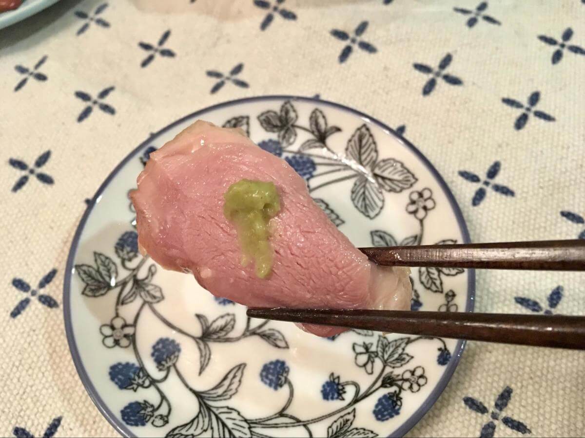 次男のお刺身発言にヒントを得て、大人はわさびをプラスしてみました。合鴨ロースの油とわさびが溶け合って、さっぱりとした口あたりになります。