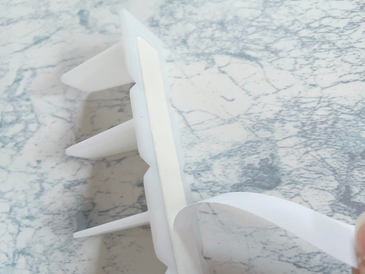 スタンドはそれぞれ2つずつ入っていて、スタンドの裏に粘着テープが付いています。剥離紙を剥がし粘着面を強く押し付け、しっかりと固定します。