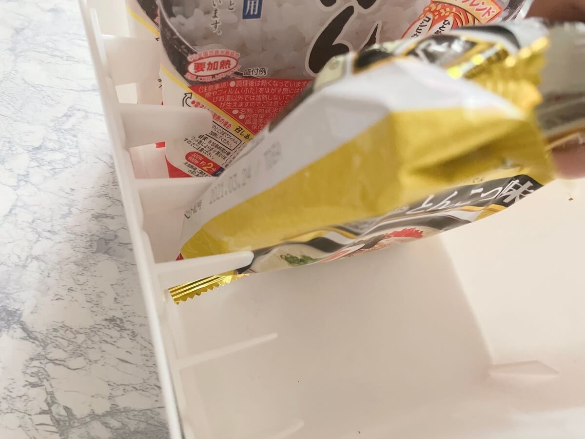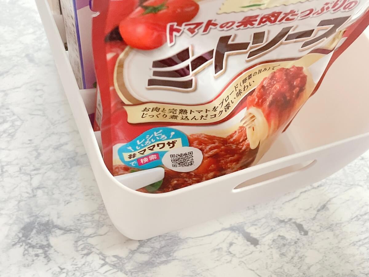 このスタンドなら、在庫が減っても残りの箱は倒れずに入れておくことができます。また袋に入ったスパゲティソースもスタンドに立てることができましたよ。