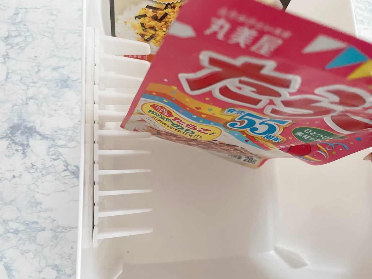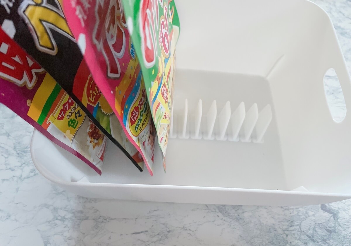 いつの間にかぐちゃぐちゃになりがちなレトルト食品やふりかけ、かつお節の袋も、スタンドを上手に使えば見やすく綺麗に収納できそうです。