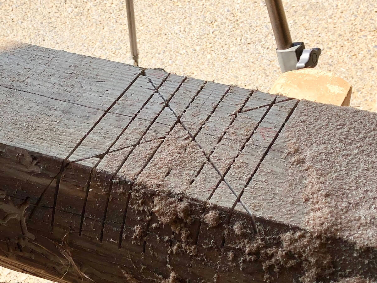 今回の「ノッチ」の加工では、「丸ノコ」の可動域では切るのが難しい部分に対し、チェーンソーを使いました(同じ理由で、のこぎりを使うこともあります)。