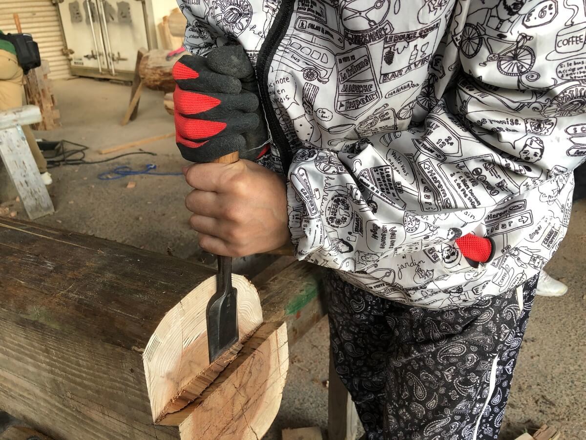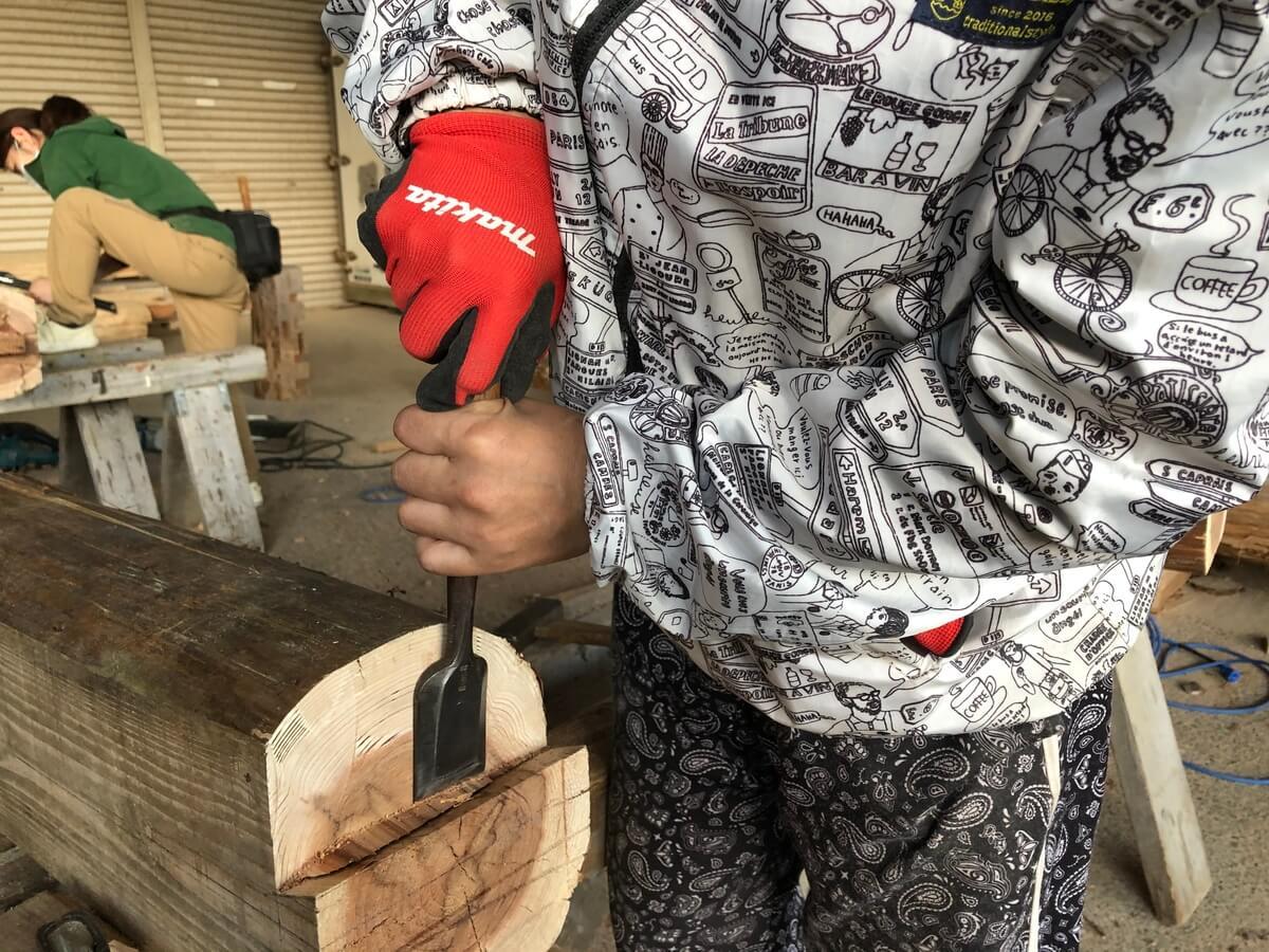 メンバーが両手で「ノミ」を握って、どんどんと削っていくなか、なぜか私だけはうまく削れません。とくに垂直の部分を削るときに力が入りません。