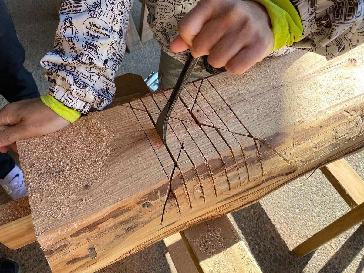 今回は、「丸ノコ」で木材に対して斜め(×印)に切れ目を入れた後、縦にたくさん切っていきました。