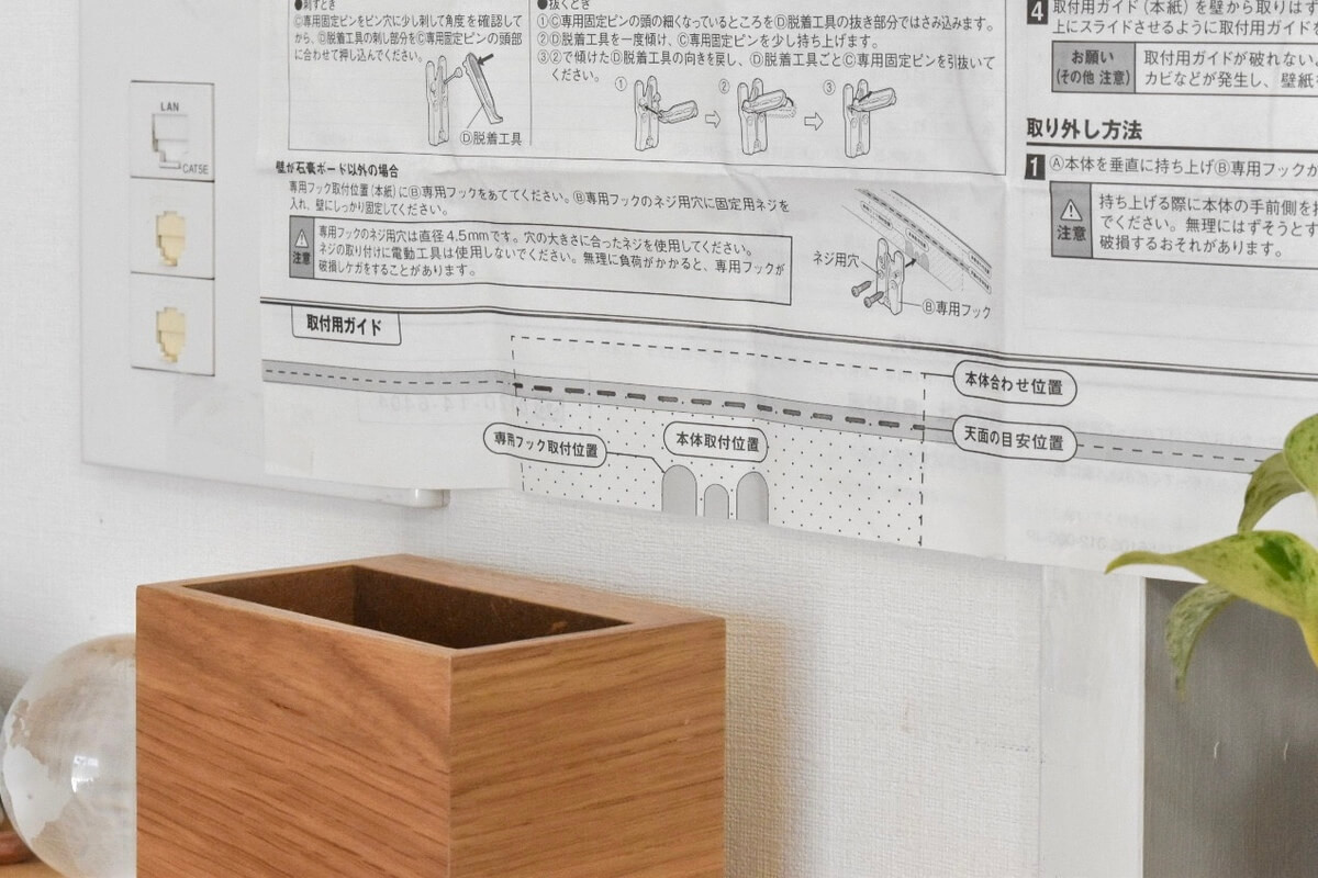①取り付けたい壁面に、ガイドとなる取扱説明書をセロハンテープなどで貼り付けます。