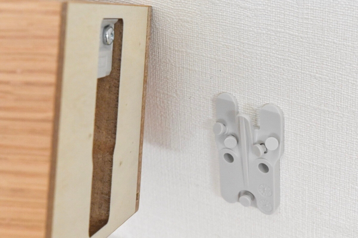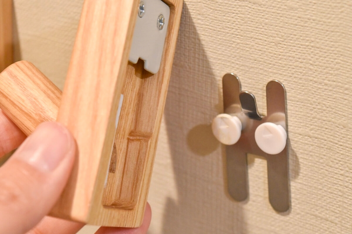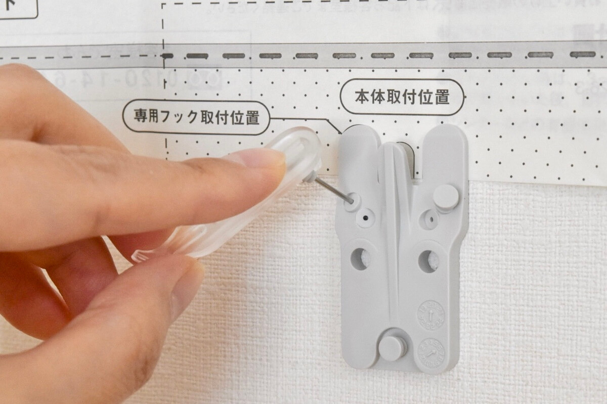 ②貼り付けた紙に書かれているイラストに合わせて、専用フックを設置し、専用固定ピンでフックを壁に取り付けます。
