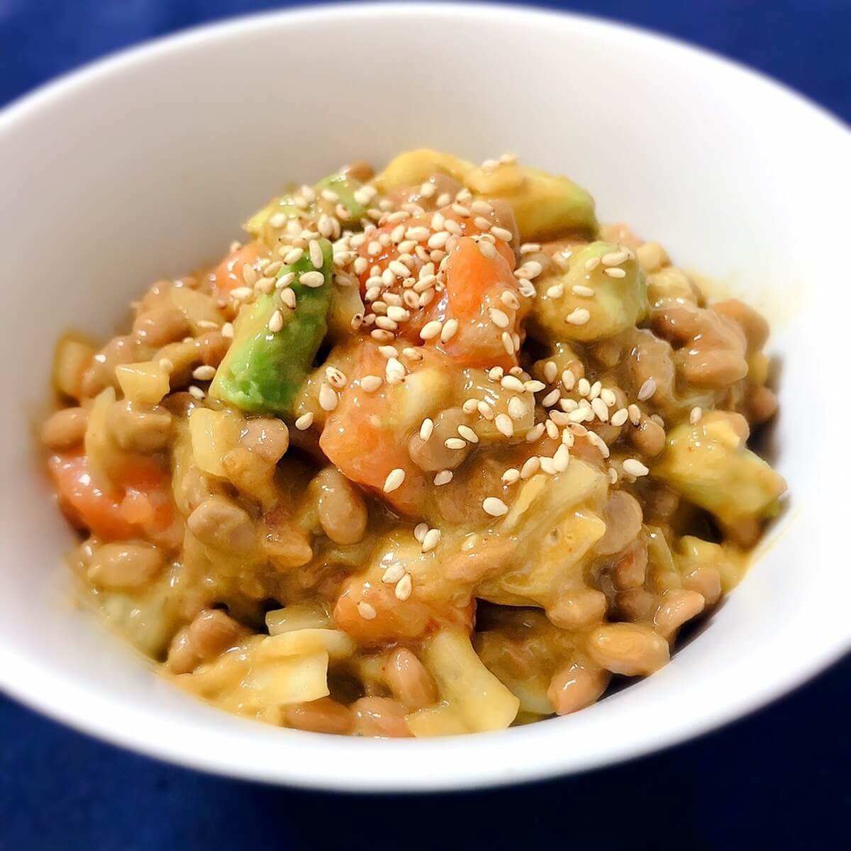 2.ビタミンEで冷え対策!サーモンとアボカドの納豆ユッケ