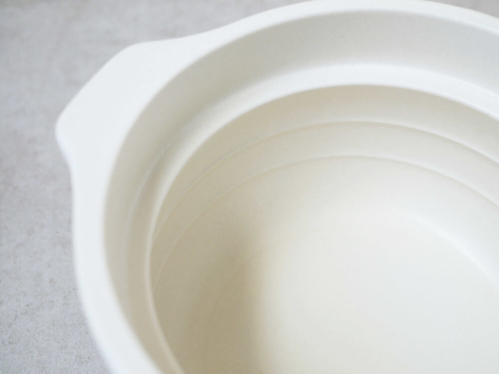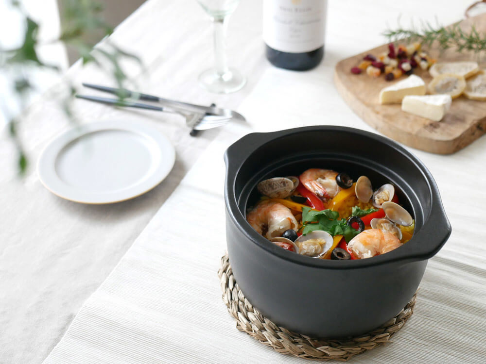 吸水率(鍋に水分が染み込む割合を示したもの)が極めて低く、料理の匂いが鍋に移りにくいのが特長。パエリアなどの炊き込みご飯の翌日に白米を炊く、残ったご飯をそのまま雑炊に、なんてことも気兼ねなくおこなえる、多様なレシピに対応してくれる頼もしい存在です。