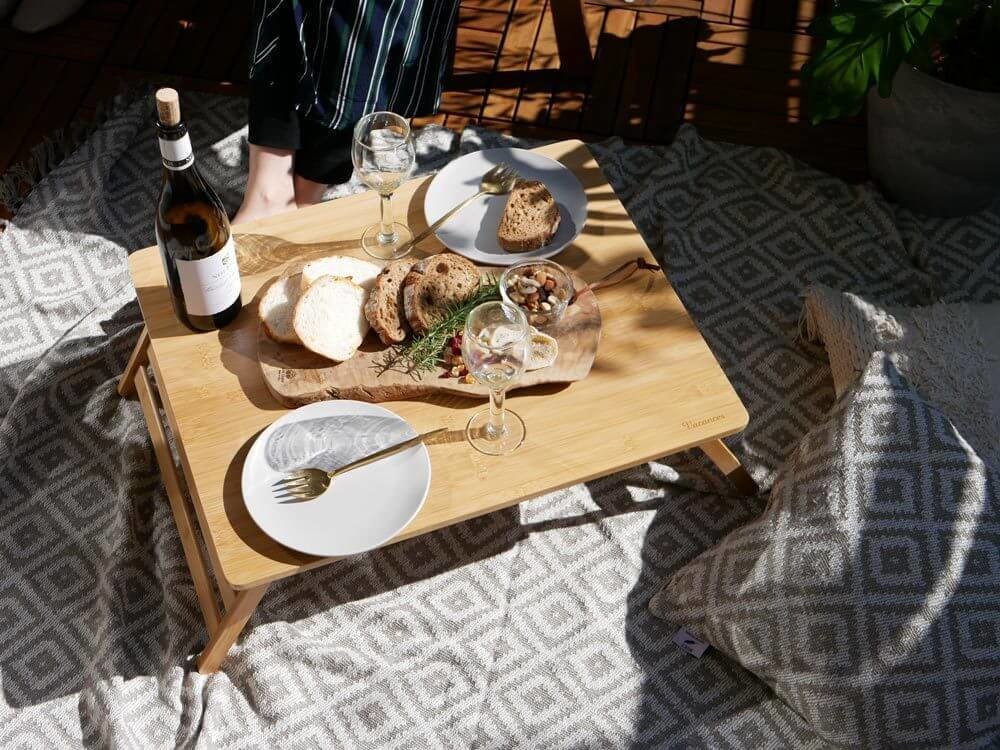 また、ピクニックにアルミやプラスチック製のテーブルではなく、竹の木目のテーブルでまんべんなく自然を感じるのも素敵ですね。