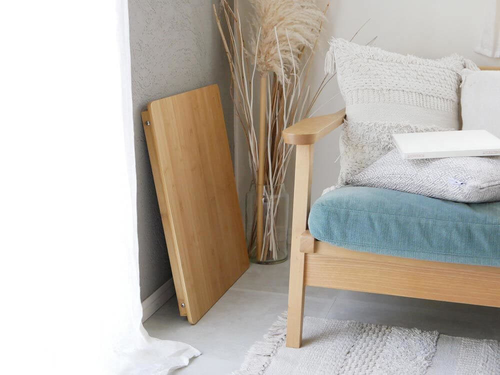 足がピッタリと天板の裏側におさまるので、板が置いてあるかの様。わざわざ置き場所を作らなくてもフレキシブルに使えるのがいいですね。