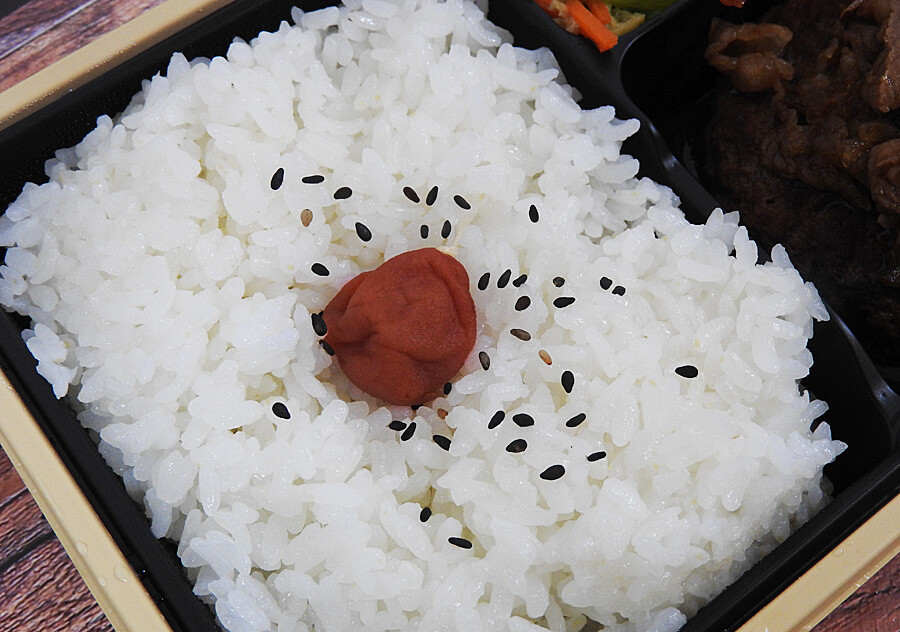 ごはんの中央部分には、大きな梅干し。 そして、特に「ごはん大盛り」にしたわけではありませんでしたが、ぎっちりと入っていて驚きました。ごはん大盛にしようか迷っていましたが、これだったらごはん普通盛りでもお腹いっぱい食べられそうです。