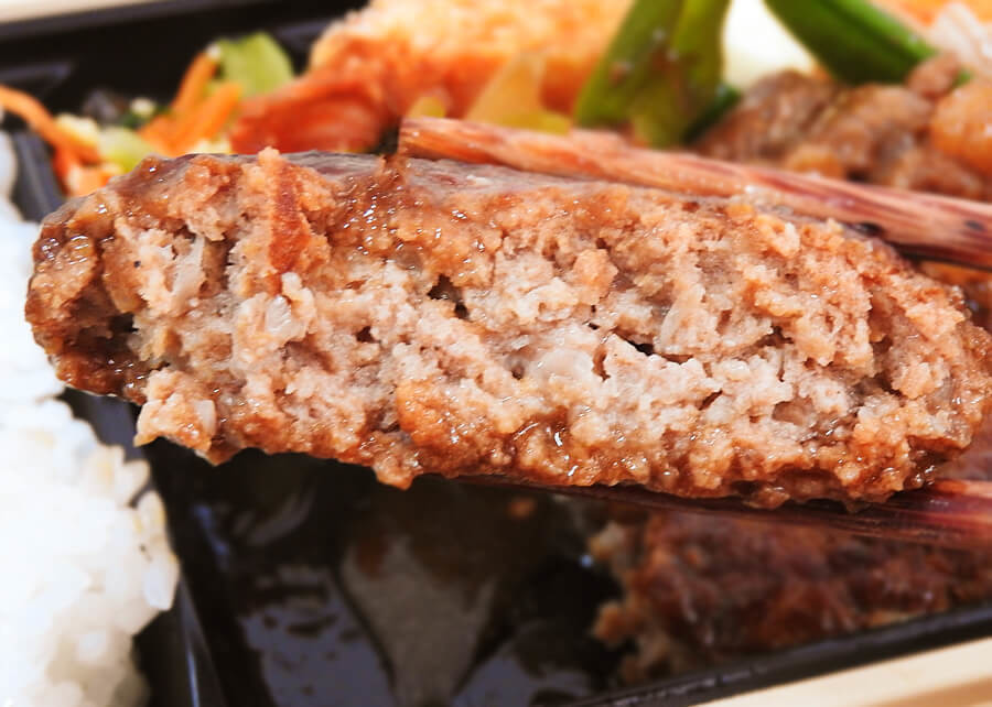 思ったよりも厚みがあります。お肉っぽさが強めに出ているハンバーグです。味としては、甘辛くて、すき焼きっぽいと感じました。ハンバーグなのにすき焼きっぽいと不思議な味わいながらも、すき焼きが好きであれば口に合いますね。