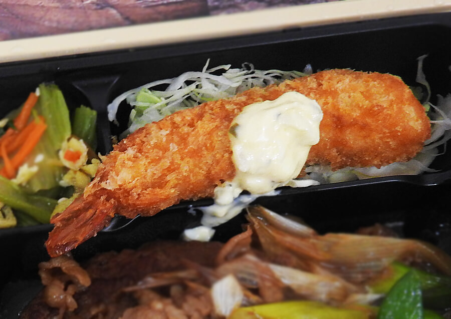 エビフライも入っていましたが、わりと小振りでした。タルタルソースがかかっているので、自分で味付けしなくていいのはラクですね。衣はどちらかといえばふわっとしていて、エビはプリプリ。エビフライはメインのおかずではありませんので、満足です。