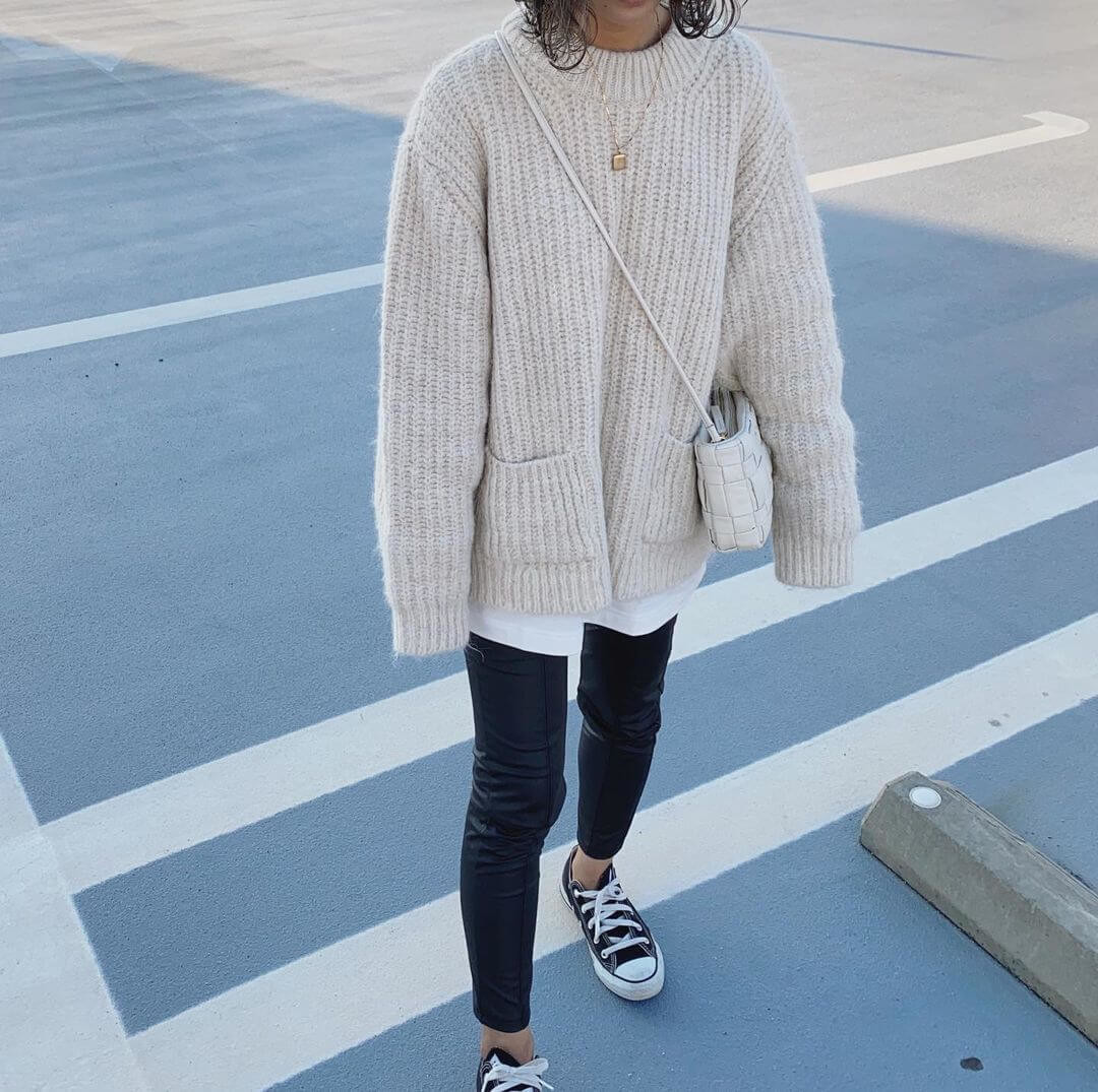 ボリューミーなニットなので、インナーに厚手のトップスを合わせても◎。 スキニーパンツと合わせてみると、メリハリのあるフェミニンコーデが完成です。