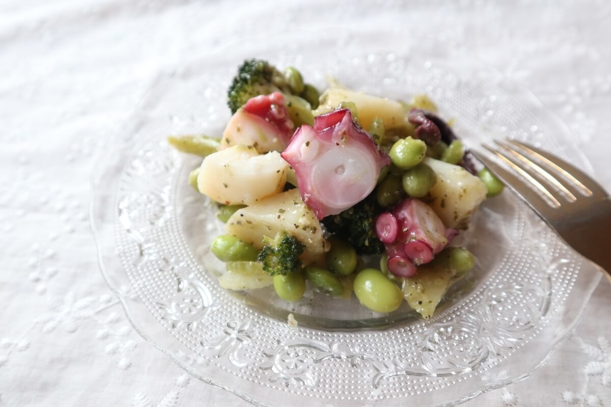 ふっくら蒸し上げたたこ、ブロッコリー、枝豆をバジルソースであえたサラダです。
