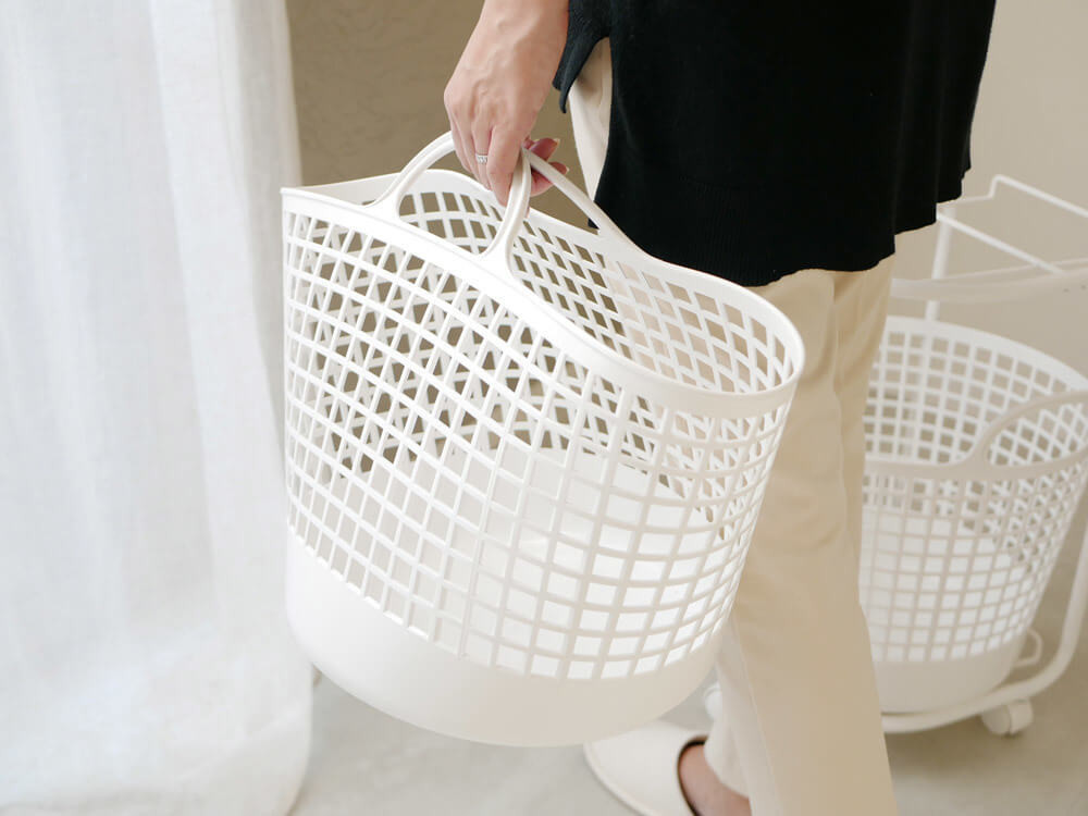 格子状のデザインのバスケットは風通しがいいので洗濯ものが溜まっても蒸れにくく、湿気やニオイがこもりません。