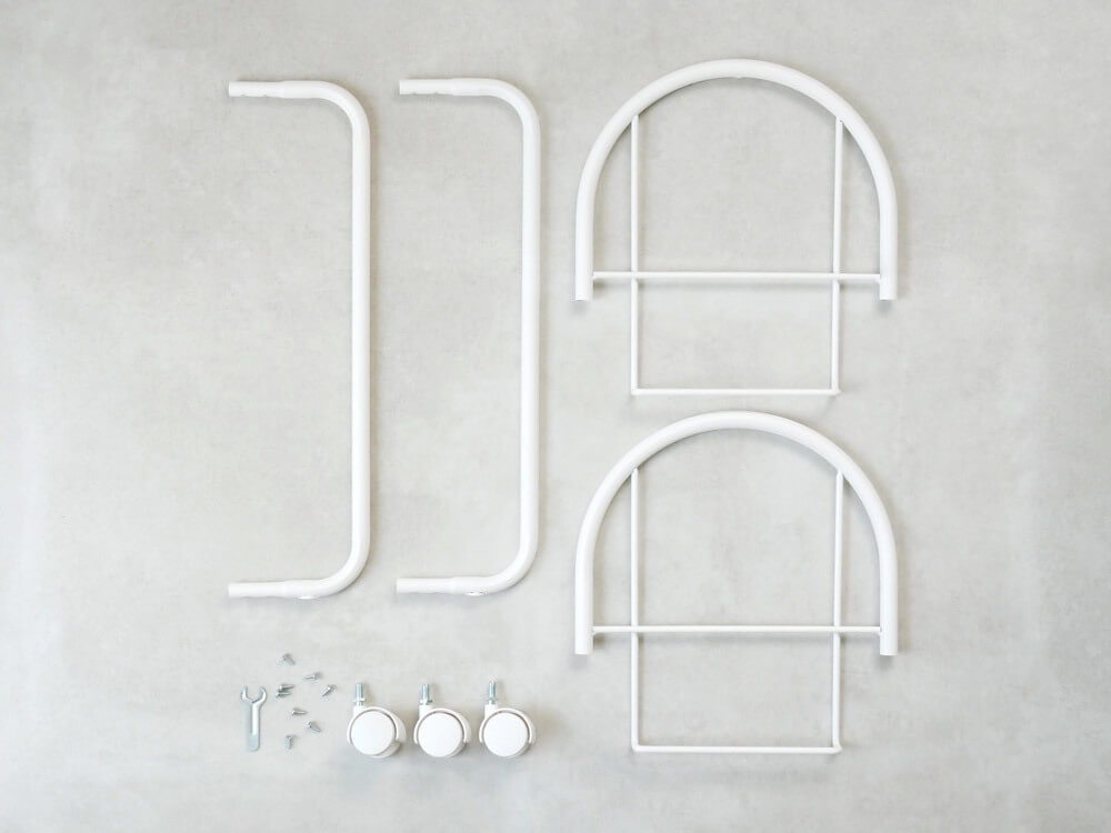 ワゴンは組み立てが必要です。付属のネジを8箇所とめて(プラスドライバーが必要)キャスターを付けてください。