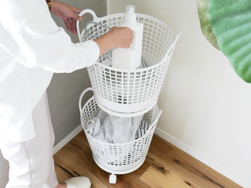 置くスペースは増えないのに、上下2段だから2倍の容量のバスケット。色落ちするものとしないもの、デリケート用洗剤で洗うもの、汚れがひどいものなど、あらかじめ分けることでお洗濯がぐっとスムーズになるんですよ。