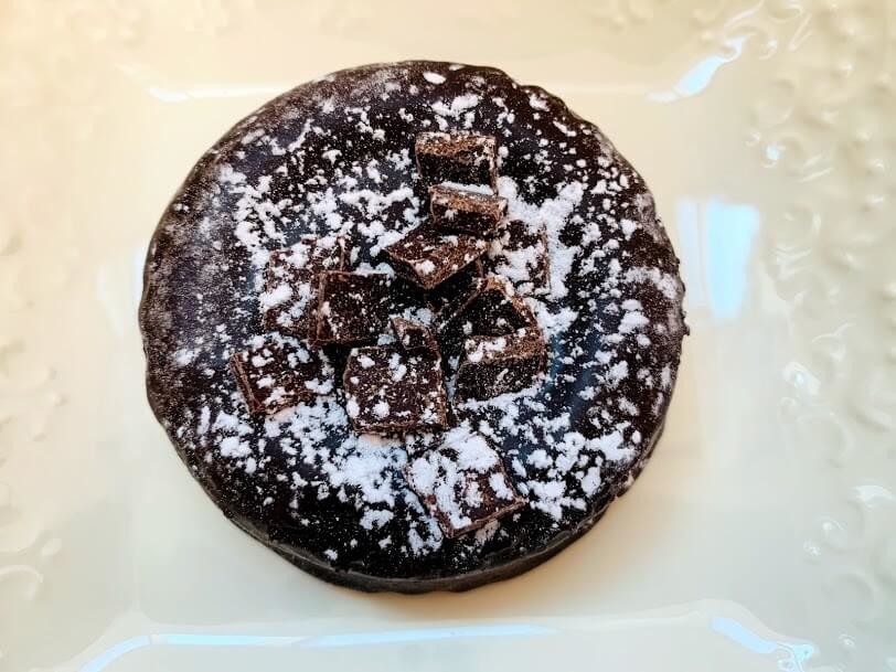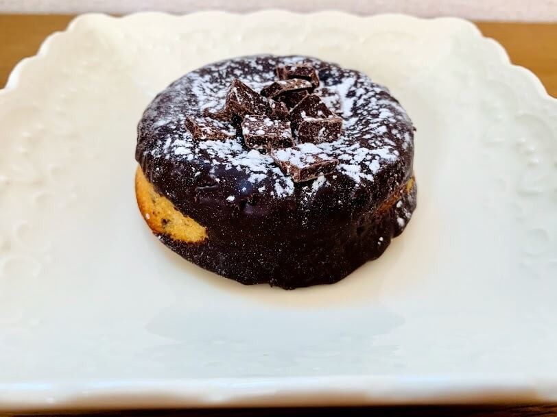 生地は想像よりふわっと柔らかい!切る前はタルトのような感じかな?と思っていましたが、スポンジというか、マドレーヌやフィナンシェのようなしっとりとした焼き菓子です。バターの香りがふんわりと立ち、上品な甘さ。多すぎないチョコチップがアクセントになっています。パサつきは全くなくとってもしっとり。