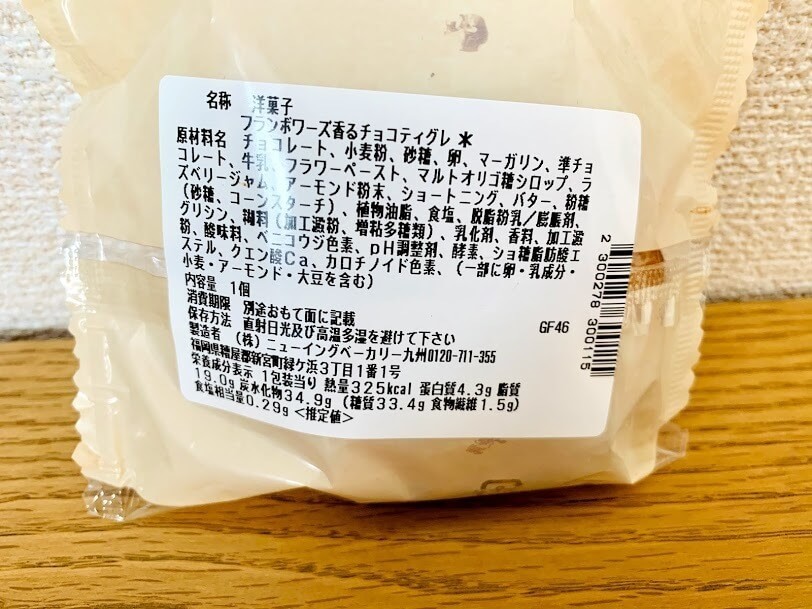 325kcalです。小ぶりサイズから考えると結構高めですが、チョコレート配合のしっとり生地、なめらかチョコクリーム、惜しみないチョココーティングにたっぷりチョコチャンク。納得のカロリーではないでしょうか。