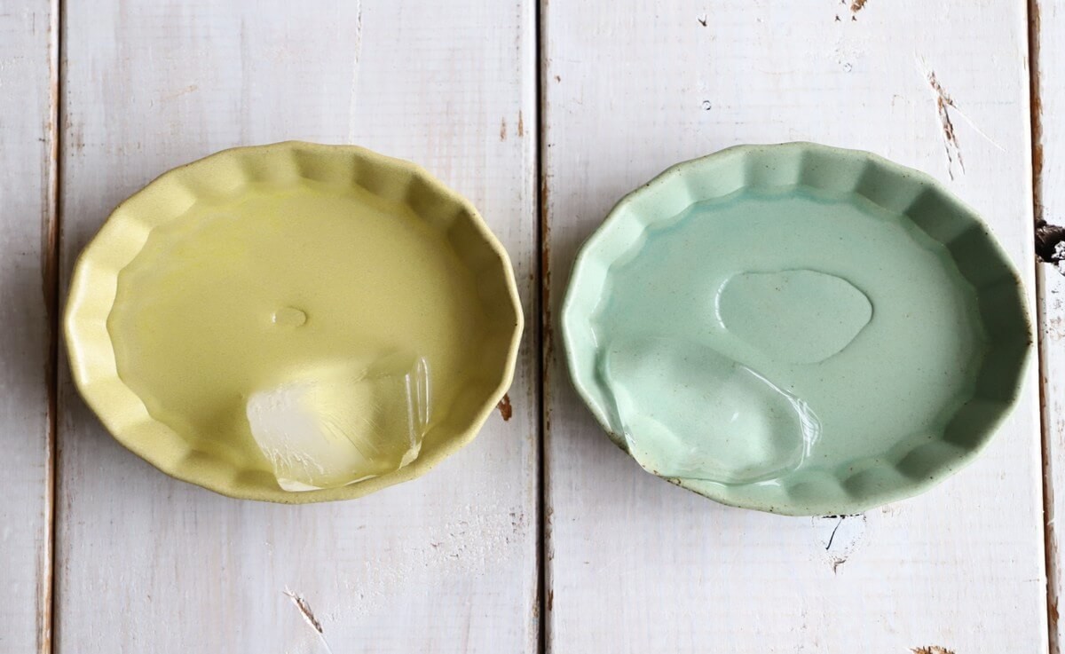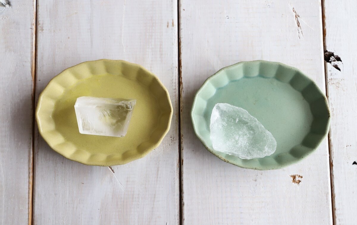 左の黄色いお皿にのせたものが家庭で作った氷。右のグリーン色のお皿にのせたものがドンキの氷です。