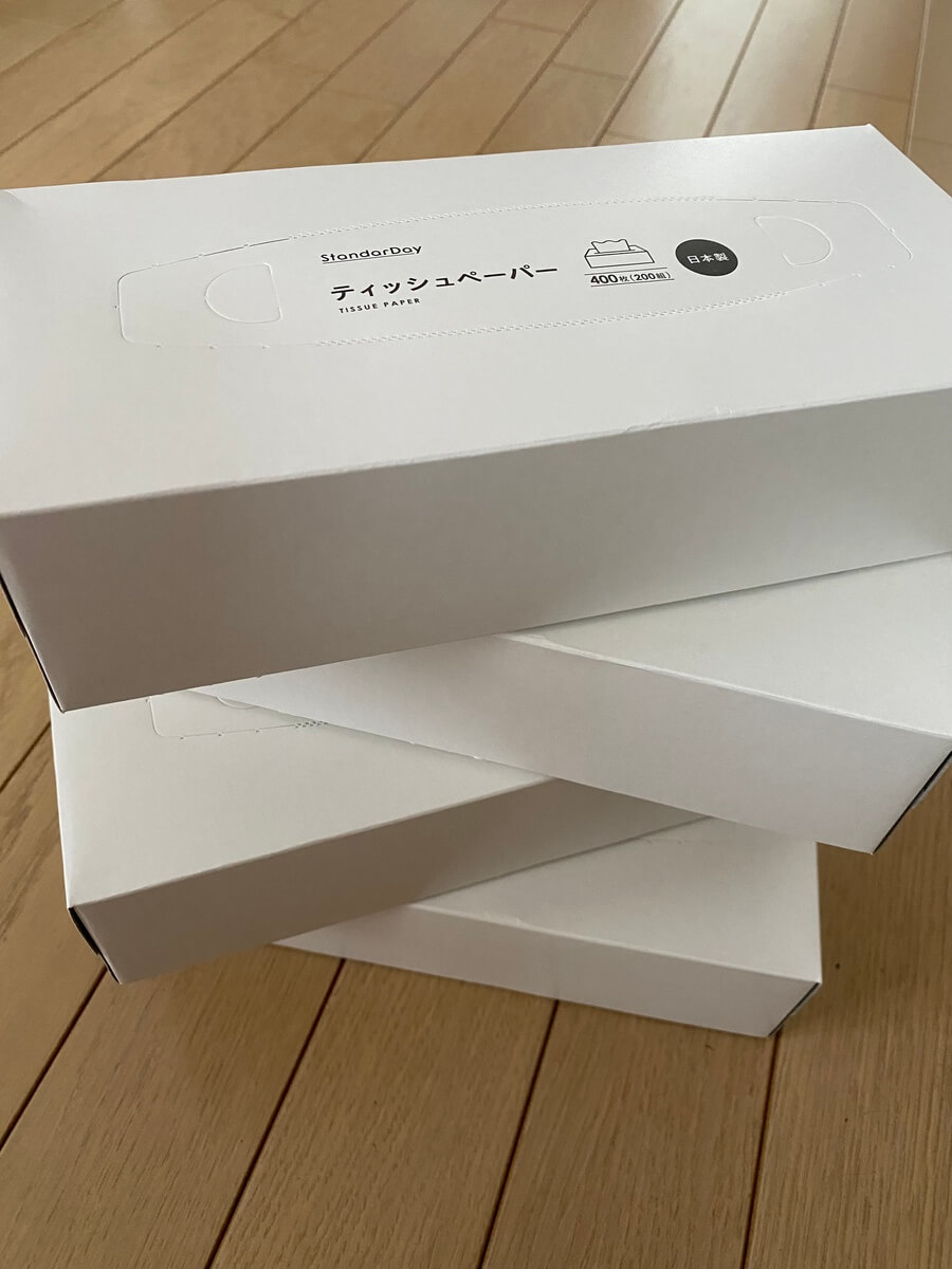 これは、買いですね。パッケージは真っ白。 ティッシュボックスはカバーを使うこともありますが、これならこのまま置いていても違和感もなくオシャレ。