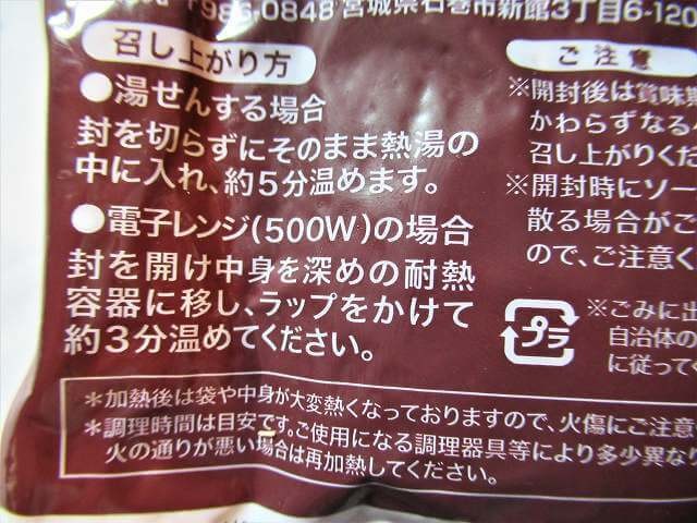 袋から中身をだし耐熱容器に入れてラップをかけ、500ワットの電子レンジで3分加熱