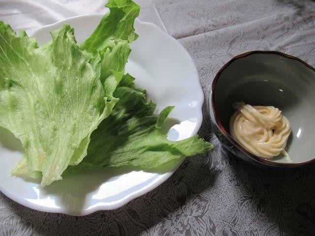 (3)パンにレタスを敷き、温めた煮込みハンバーグをはさむ