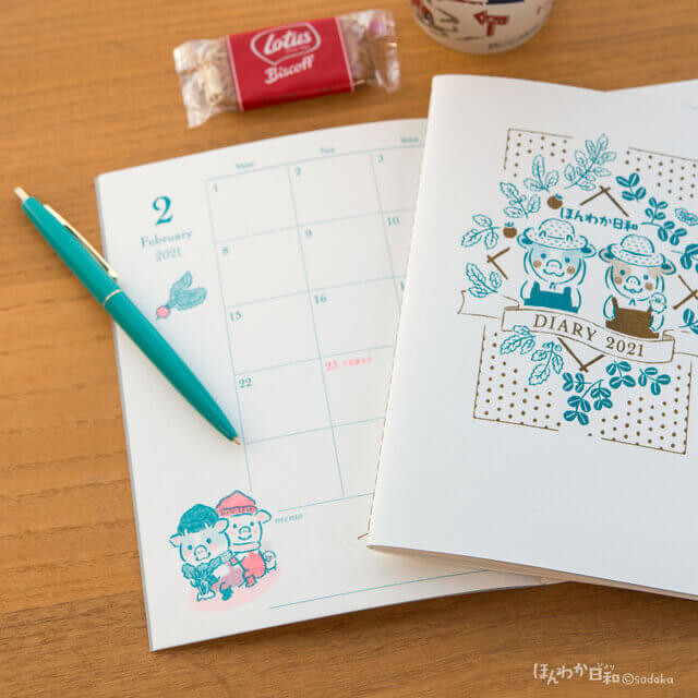 こちらの手帳のメインキャラクターは、うしの「モウ」と「ウフ」。モウとウフが繰り出す菜園での生活が描かれ、毎月旬の野菜や果物を収穫する姿を楽しめます。