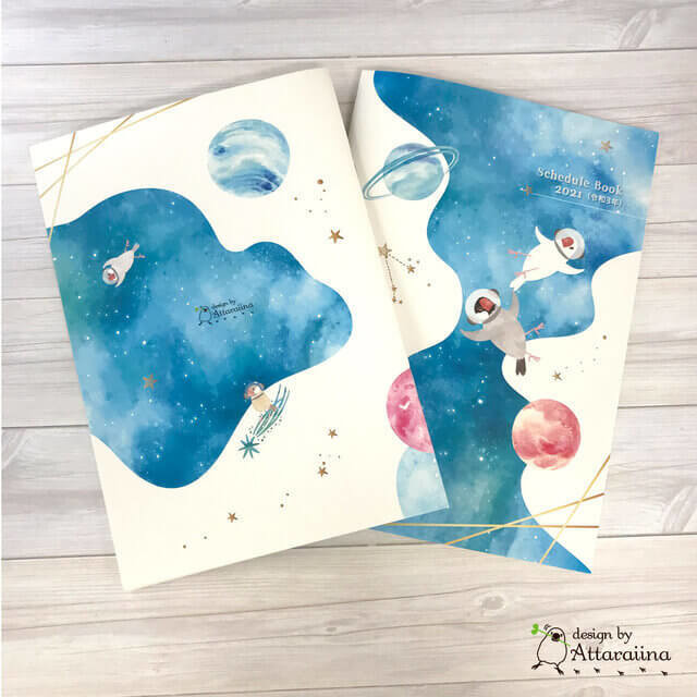 最初にご紹介するのは、かわいい文鳥さんがデザインされた手帳です。宇宙スペースを優雅に浮遊している文鳥さん!とてもキュートで鳥好きさんにはたまらないデザインですね。