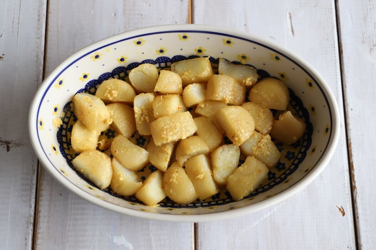 (1)いももち10個は電子レンジで解凍し、キッチンばさみか包丁で3等分にし、耐熱容器に入れ、カルディの「ぬって焼いたらカレーパン」を大さじ1ほど入れ全体にあえる。(カレー粉小さじ2分の1~1ほどで代用できます)