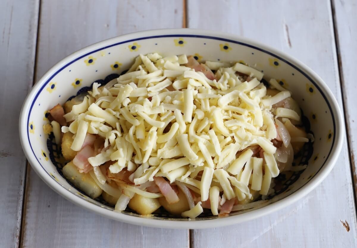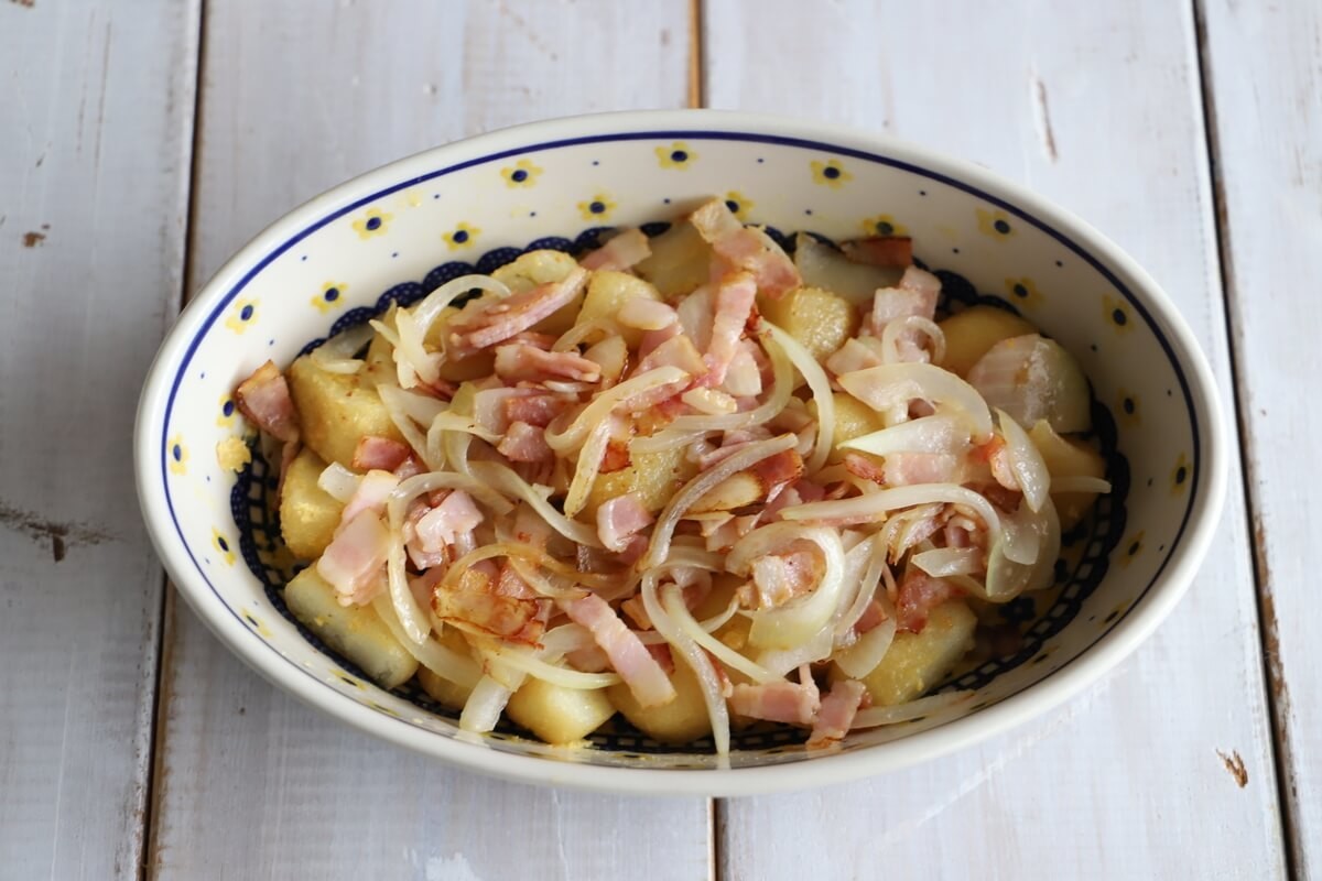 (2)玉ねぎ4分の1を6~7ミリ幅ほどに切ったものと、ベーコン3枚を1cm幅に切ったものをオリーブオイル大さじ1で炒め、いももちの上にのせる。
