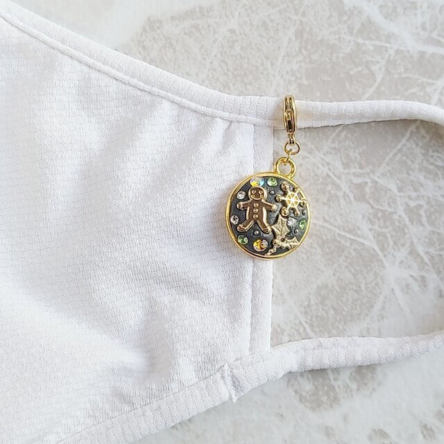 こちらは、クリスタルクレイを土台にスワロフスキーやメタルパーツが装飾されているマスクチャームです。パーツは雪の結晶やセイヨウヒイラギ、ジンジャーブレッドマンとクリスマスをイメージするものばかり!