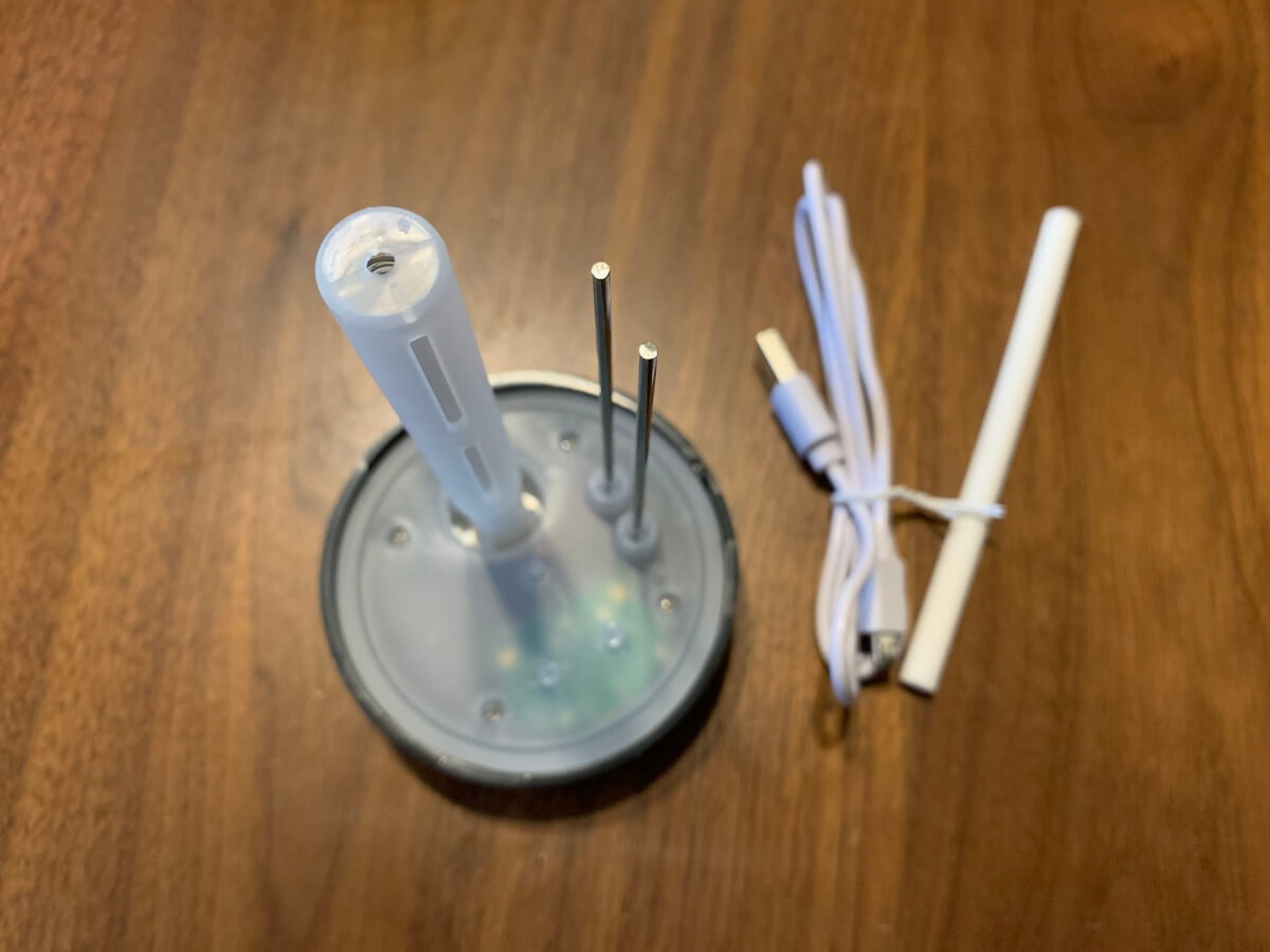 超音波加湿方式で、連続使用時間は4時間となっています。箱にはケーブルと吸水芯リフィルが付いているので、買い足し不要ですぐに使い始められます。