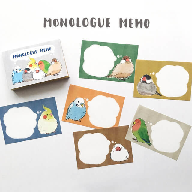 最初にご紹介するのは、物思いにふける小鳥たちがかわいいメモ帳です。文鳥やインコなど6種類の小鳥たちの考え事をしている様子が描かれています。