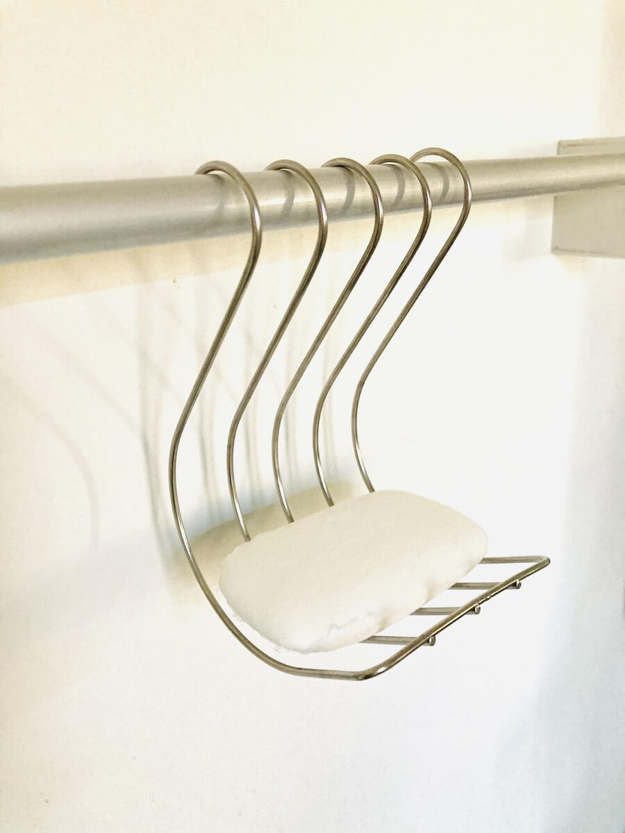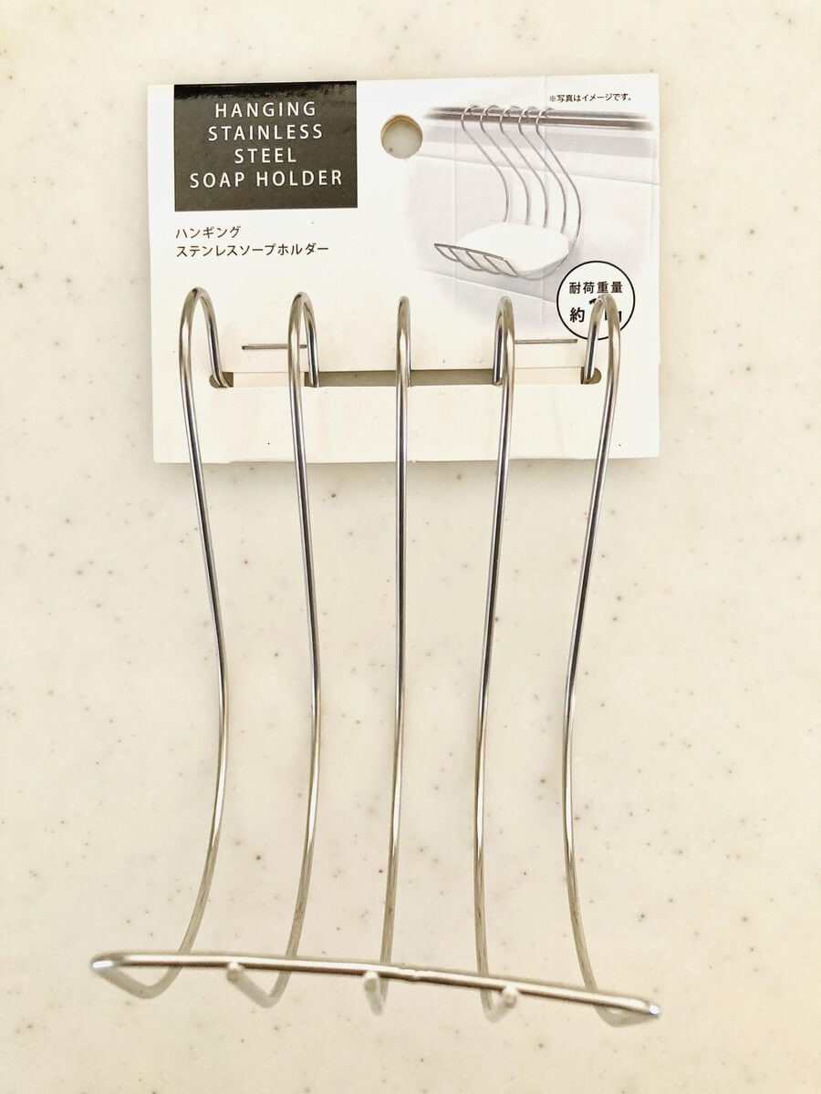 そんなときに見つけたのが、セリアの「ハンギングステンレスソープホルダー」でした。浴室のタオルハンガーにかけられて、浮かせる収納が叶うアイテムに「これだ!」と思い購入してみました。
