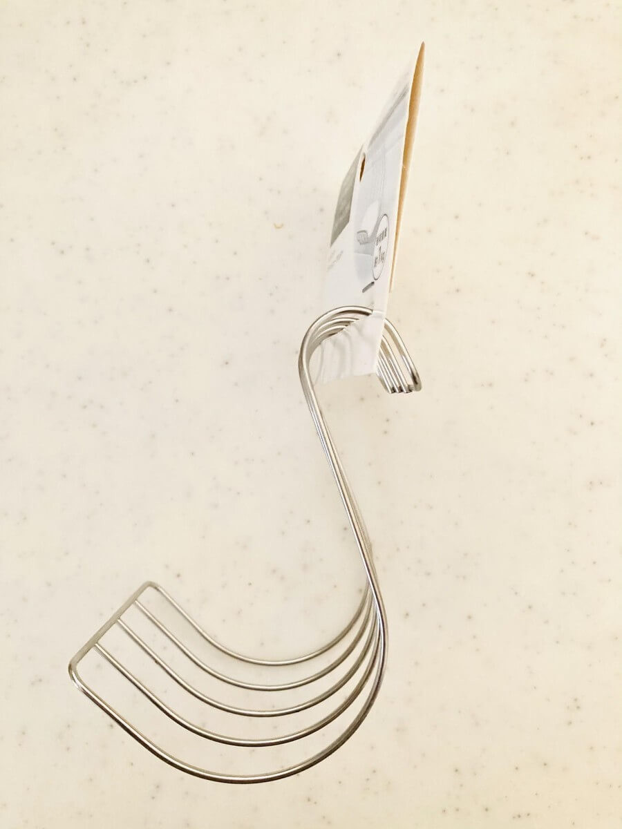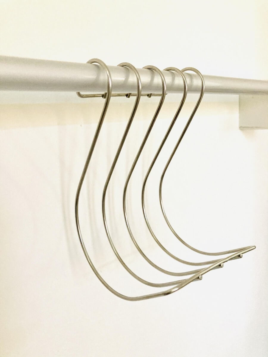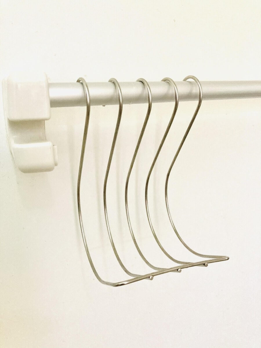 商品を真横から見ると...上部はS字フックのように大きくカーブを描いていますが、石けん置きの部分は英語の「J」のように先がストレートになっています。石けんを取りやすい形になっていました。