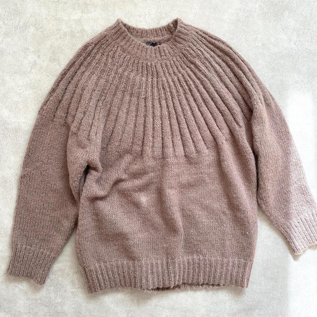 ネックラインと袖口、裾の部分がリブ編みになっているのでシルエットに表情がありますね。