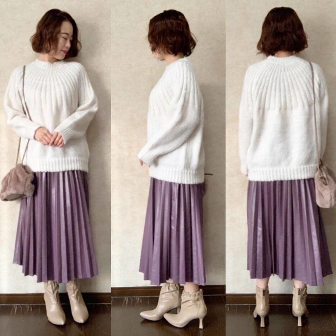 パープル色のプリーツスカートとコーディネートして、フェミニンなルックスを実現しています。