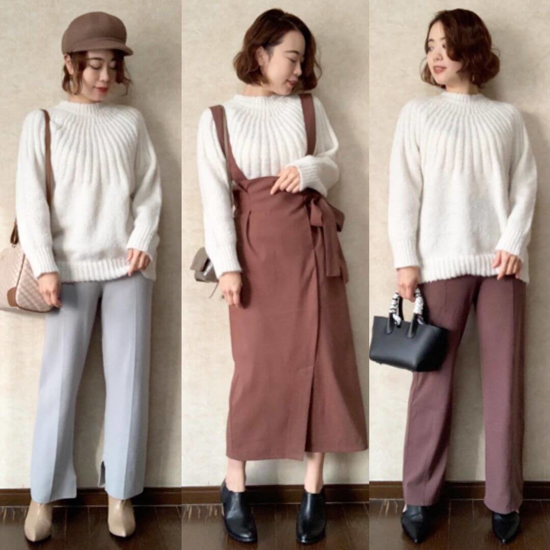 こちらはホワイトのワンカラーデザインで、冬コーデに清潔感を与えてくれるニット。