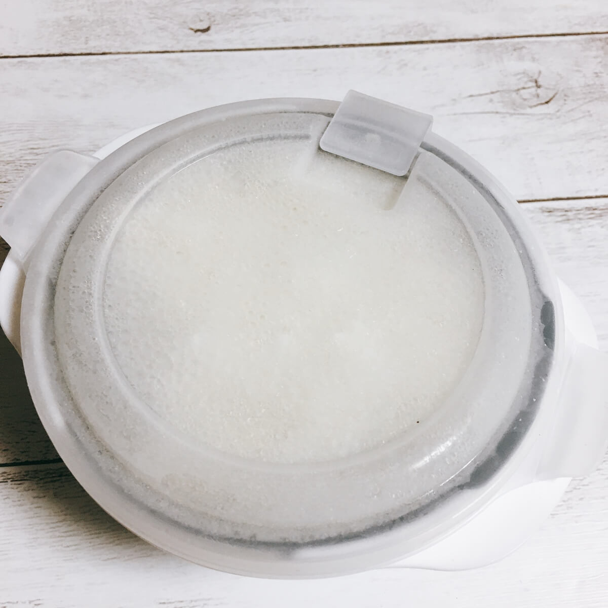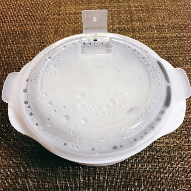 蒸気抜き弁だけを開けて、蓋をしたまま電子レンジで解凍します。