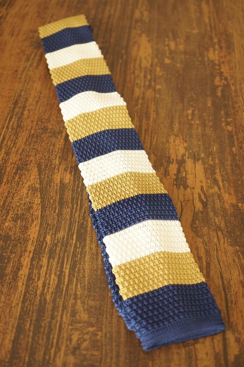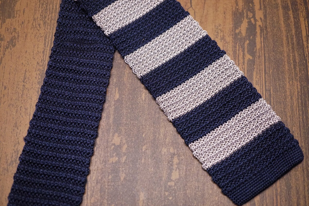 シルク100%のニットタイはなめらかな肌触りに対し、ポリエステル100%のニットタイは少しゴワゴワした肌触りです。