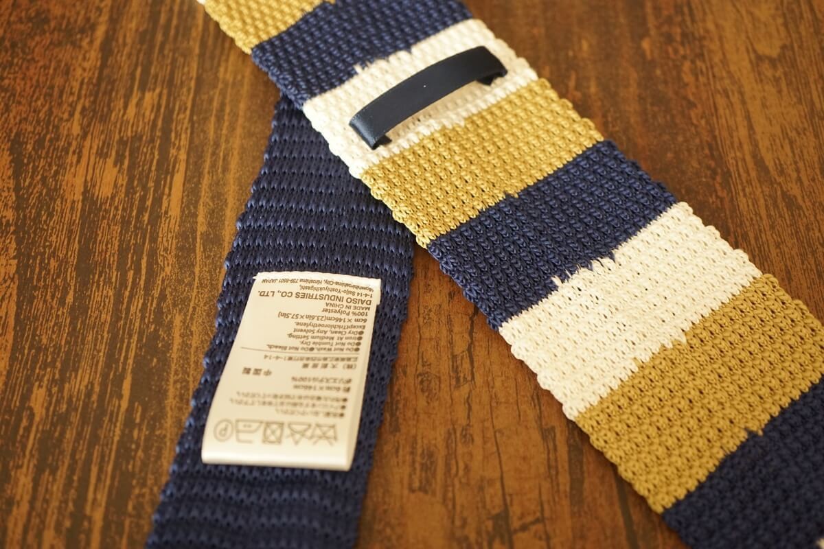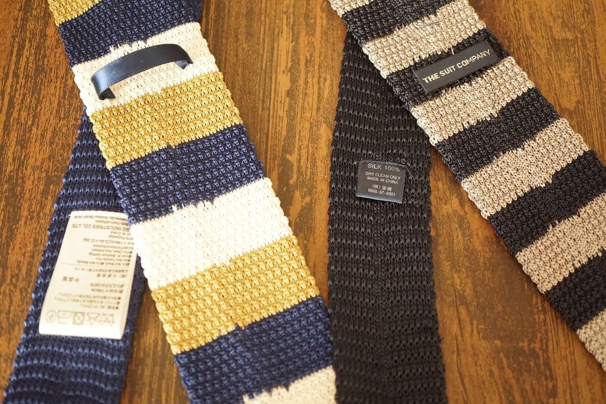 写真右のニットタイは「THE SUIT COMPANY」の商品なのでループに会社名が書いてありますが、写真左のダイソーのニットタイは何も書いてありません。