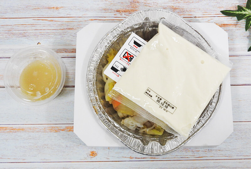 温めて食べる方法は、添付の紙に記載されています。 「ゆず香る お家豆乳牛鍋定食」の作り方を例にとると……。